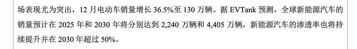 具体来看,2024 年 12 月全球新能源汽车销量达到190万辆,同比增长25.6%,连续第四个月创下销售纪录。地区分布上,中国市场表现尤为突出,12月电动车销量增长36.5%至130万辆。据EVTank预测,全球新能源汽车的销量预计在2025年和2030年将分别达到2,240万辆和4,405万辆,新能源汽车的渗透率也将持续提升并在2030年超过50%。